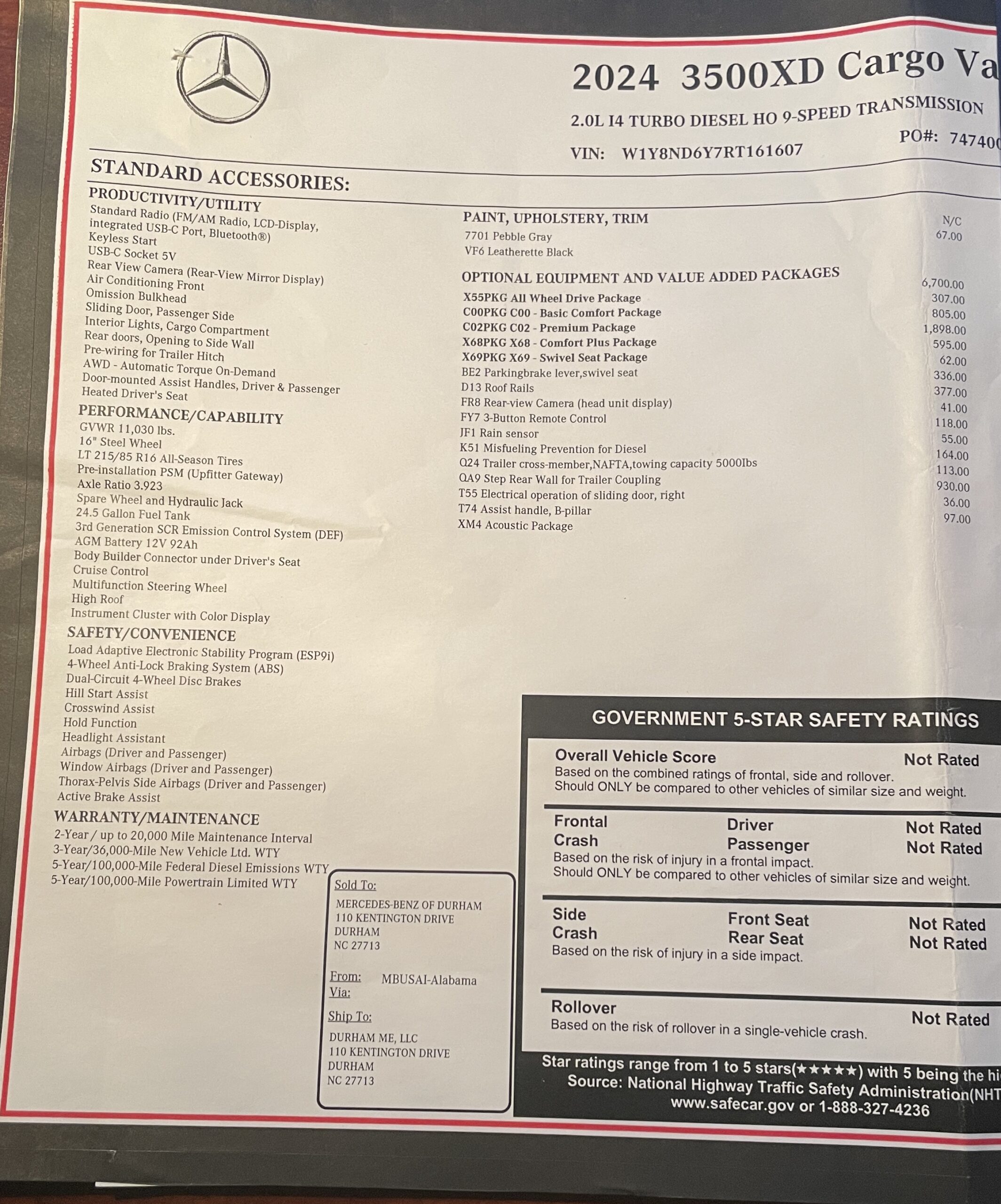 2024 Mercedes Sprinter AWD 3500XD 170″ 4 cyl HO