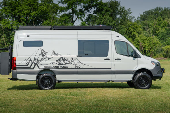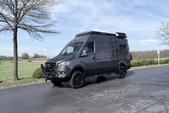 This 4×4 Sprinter was designed to serve as an proper 4 season off-grid adventure mobile for an active family with the unique capability to both seat and sleep 4 within the smaller 144” chassis. This van’s interior layout is designed for quick transformation to adapt to the situation at hand, becoming a gear hauler, mobile office, lounge, adequate kitchen, or a bedroom for 4 in just a few minutes. A great deal of thought went into streamlining the actions required to transition through the different configurations to make sure the process was simple and painless. The interior uses durable, low-maintenance materials and modern black fixtures to create a clean utility-minded look with a thoughtful mix of textures and color.