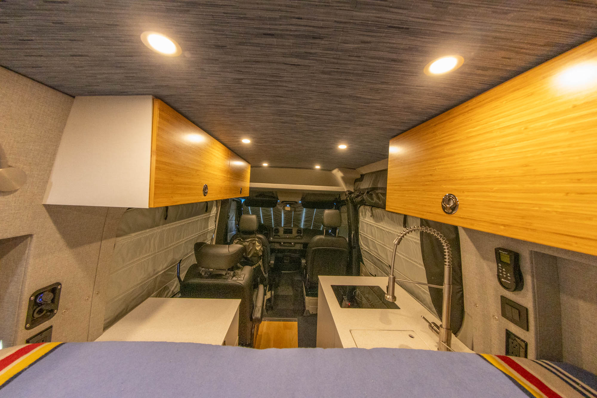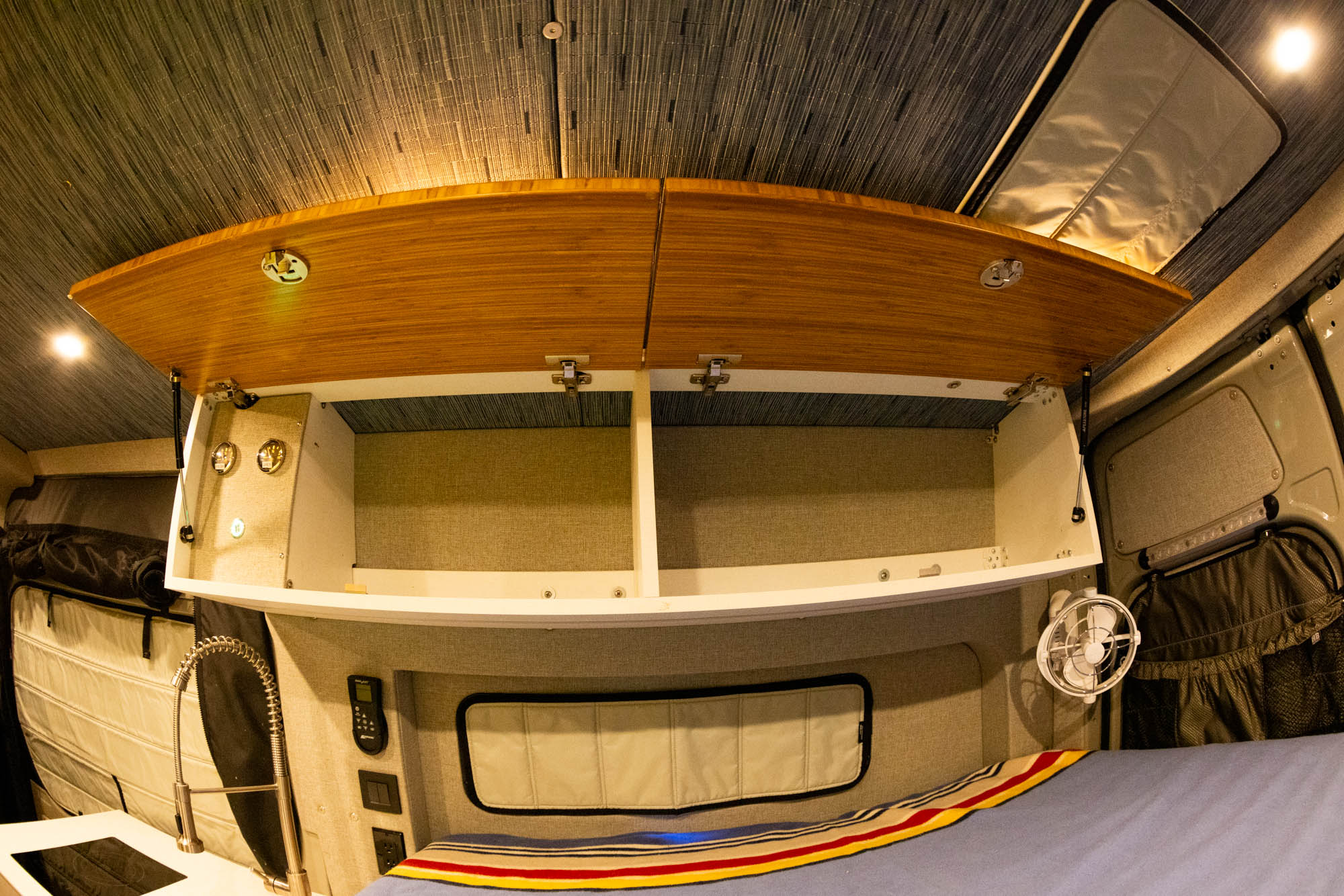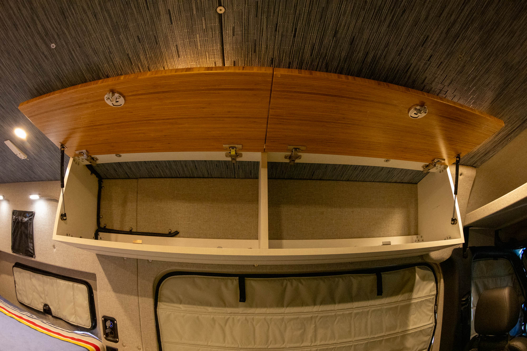 - Flatline Van Co bamboo-fronted upper cabinets with Push-Lock latches + Soft Close hinges
