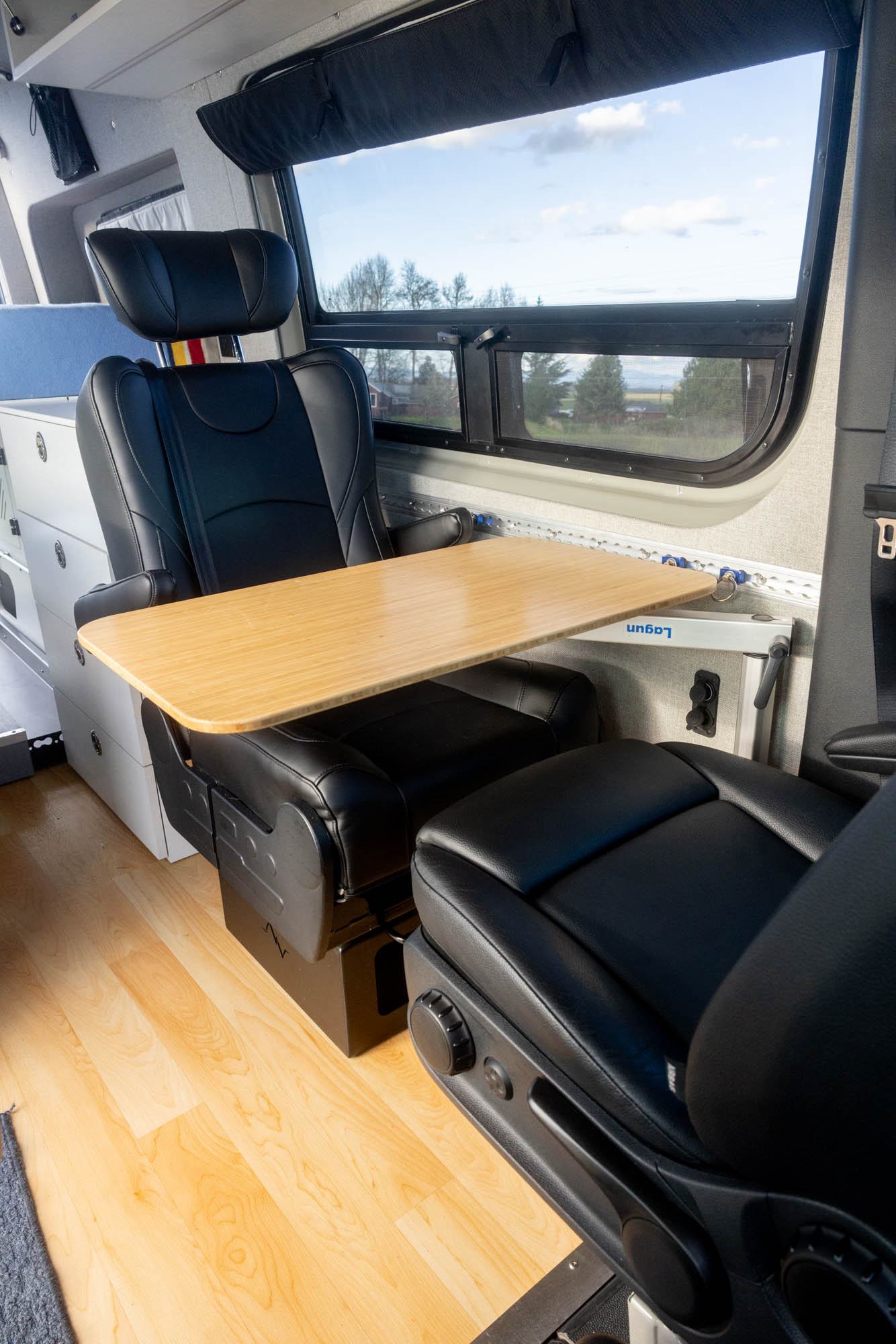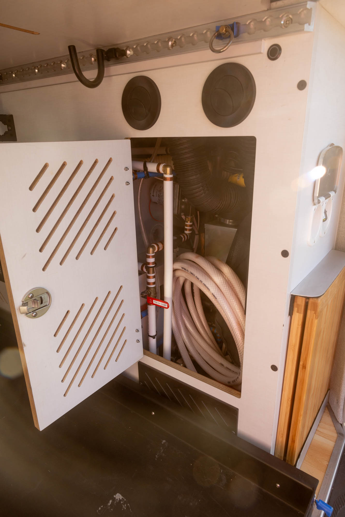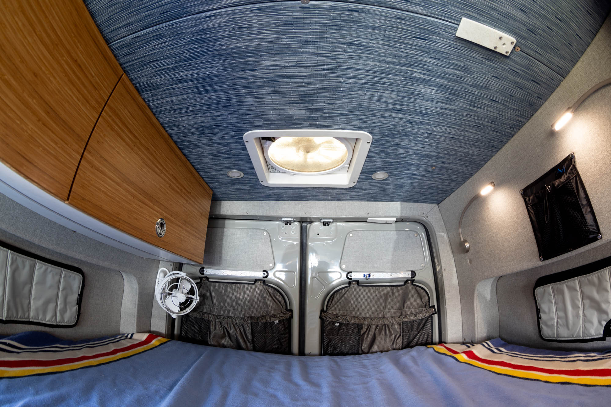 - Flatline Van Co bamboo-fronted upper cabinets with Push-Lock latches + Soft Close hinges
