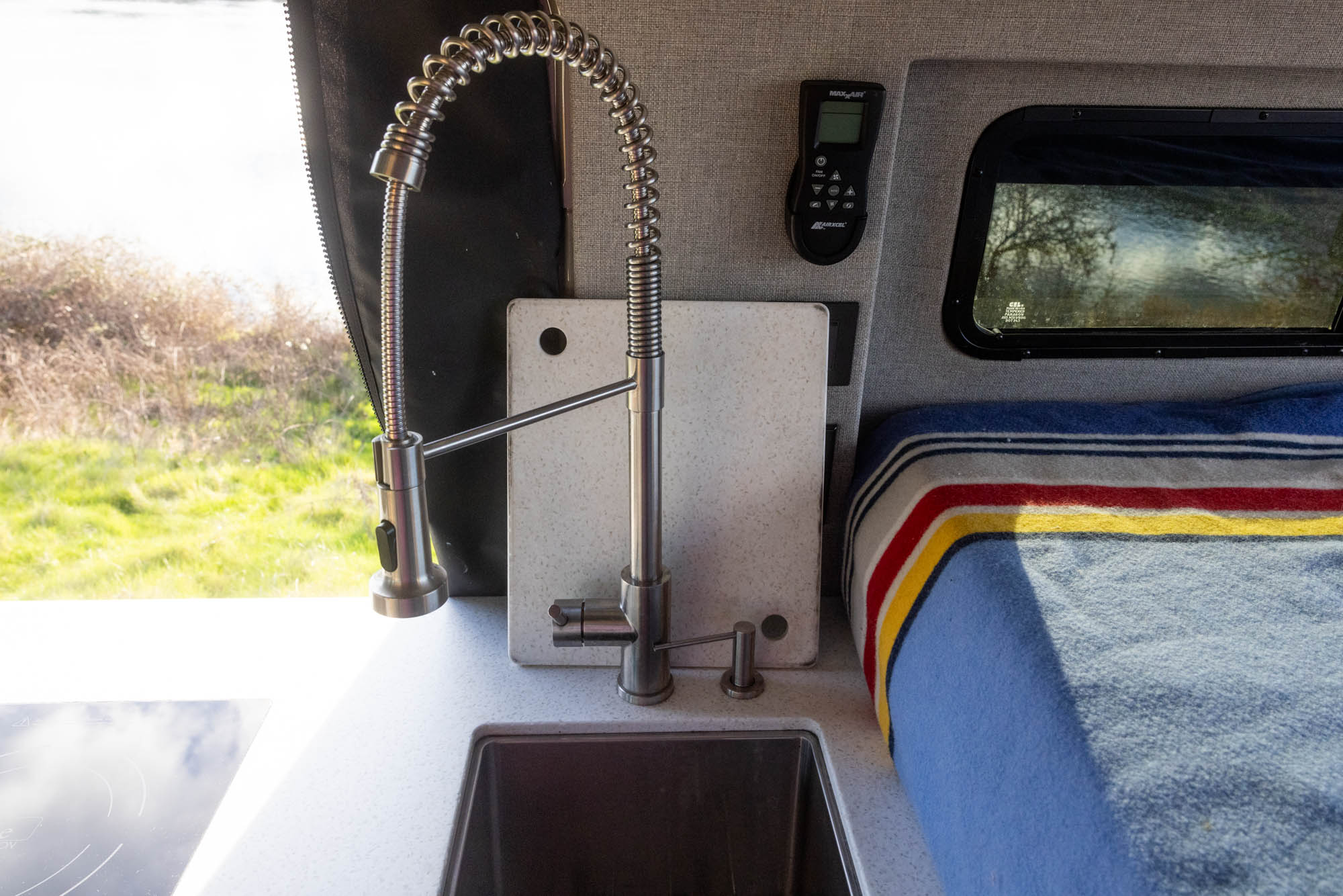 - Stainless sink with gooseneck faucet + cutting board cover