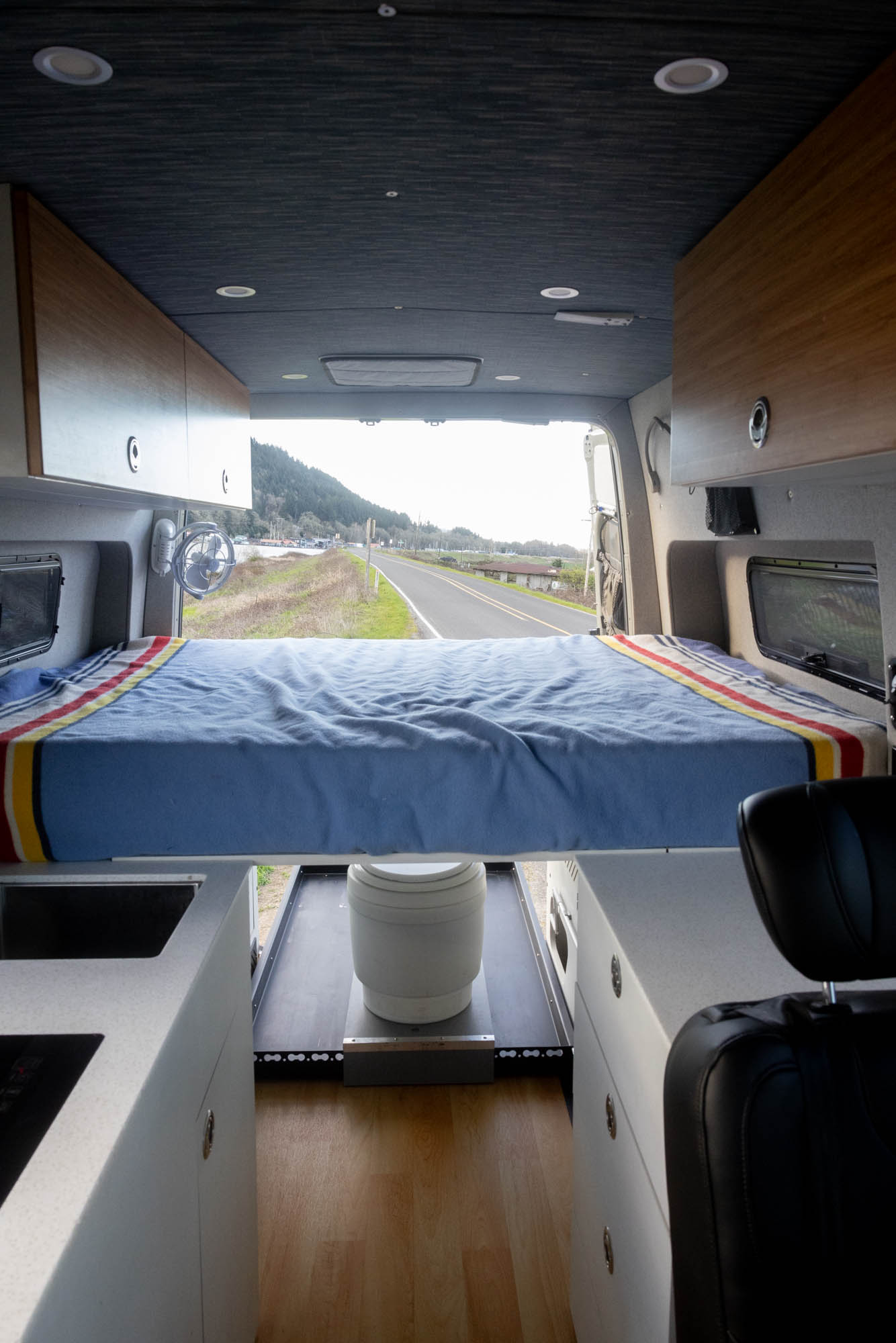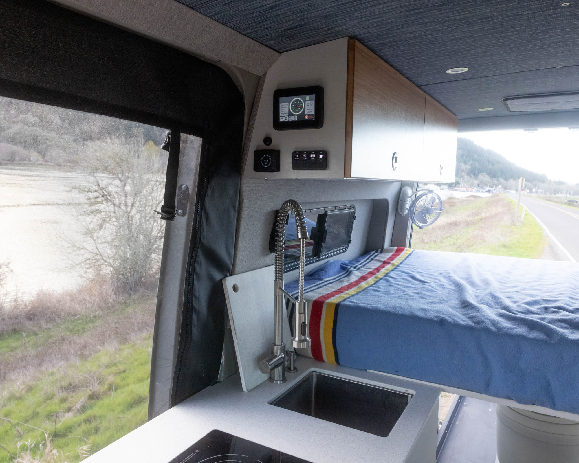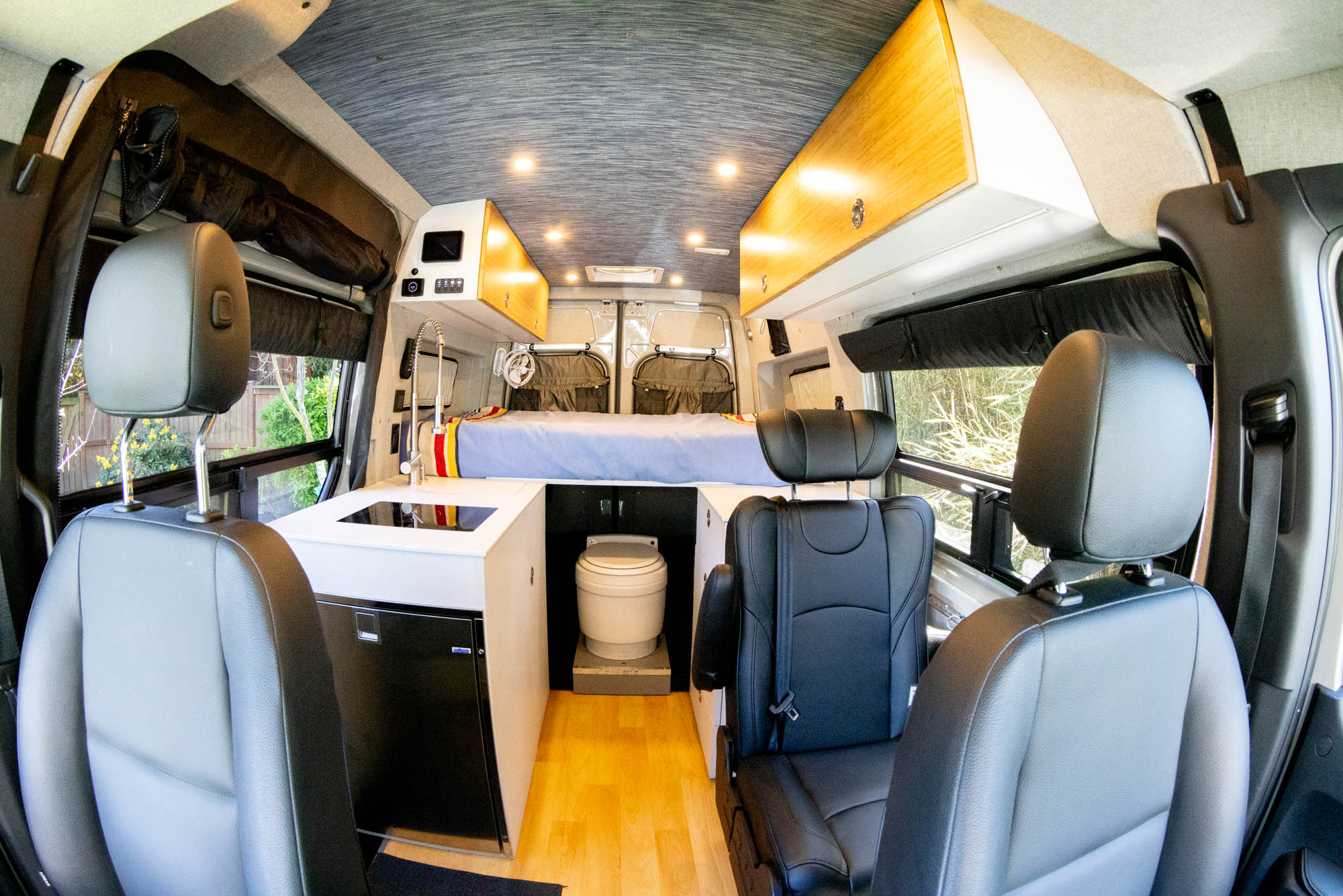 Drives 3, sleeps up to 4, and functions like a true two-room setup—in addition to serving as an additional queen size bedroom, the GFC rooftop tent doubles as a shaded hangout, reading spot, or elevated deck for epic views. The van’s interior finishes were designed to evoke a sense of calm, and its front-to-back visibility makes the living space feel open and larger than it is.