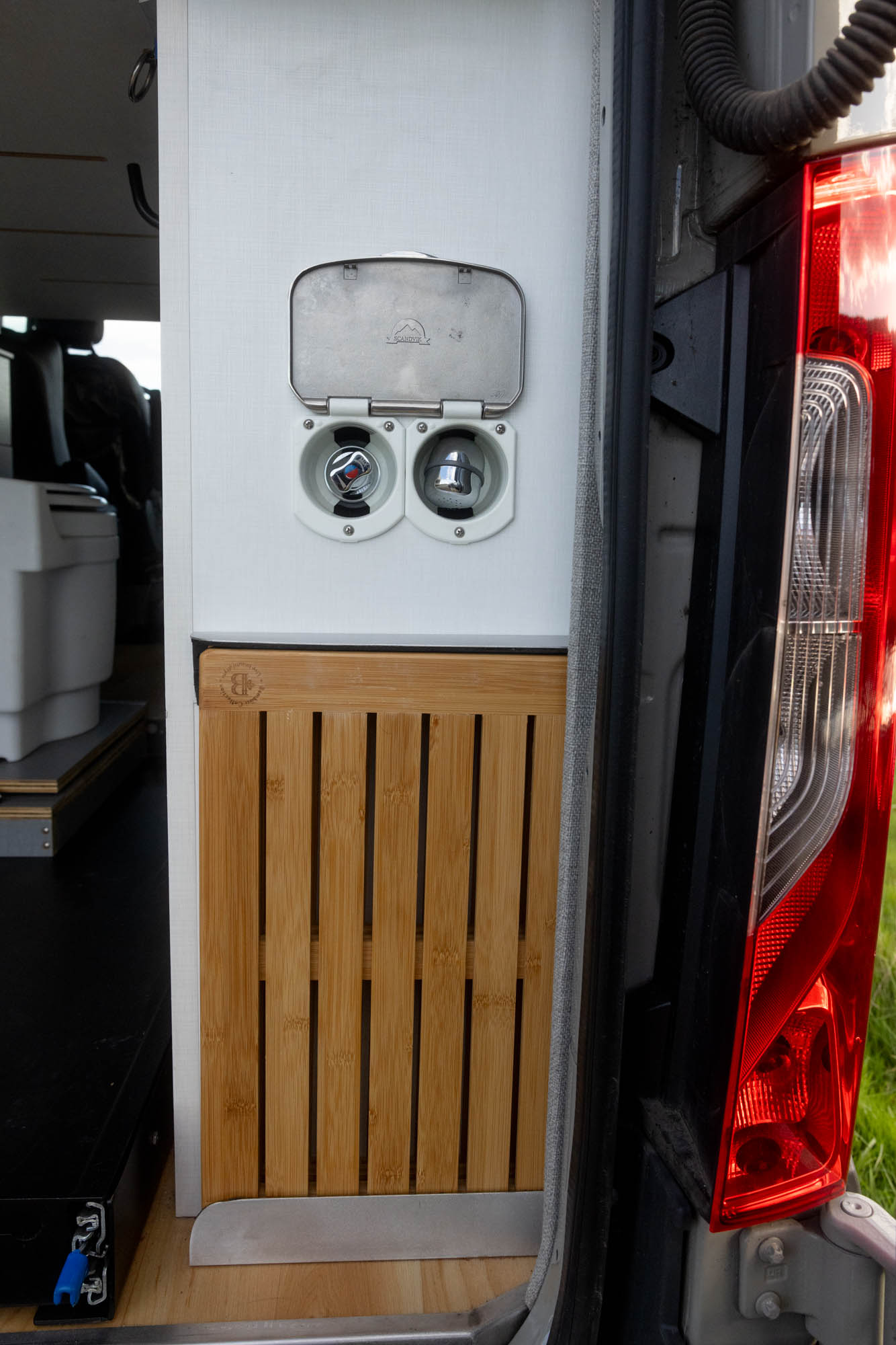 - Rear outdoor shower with ripstop curtain and bamboo mat