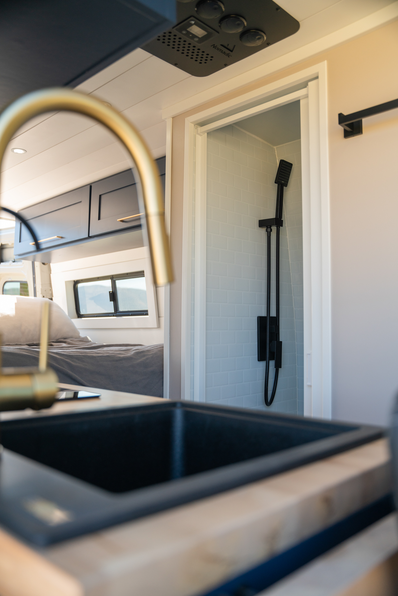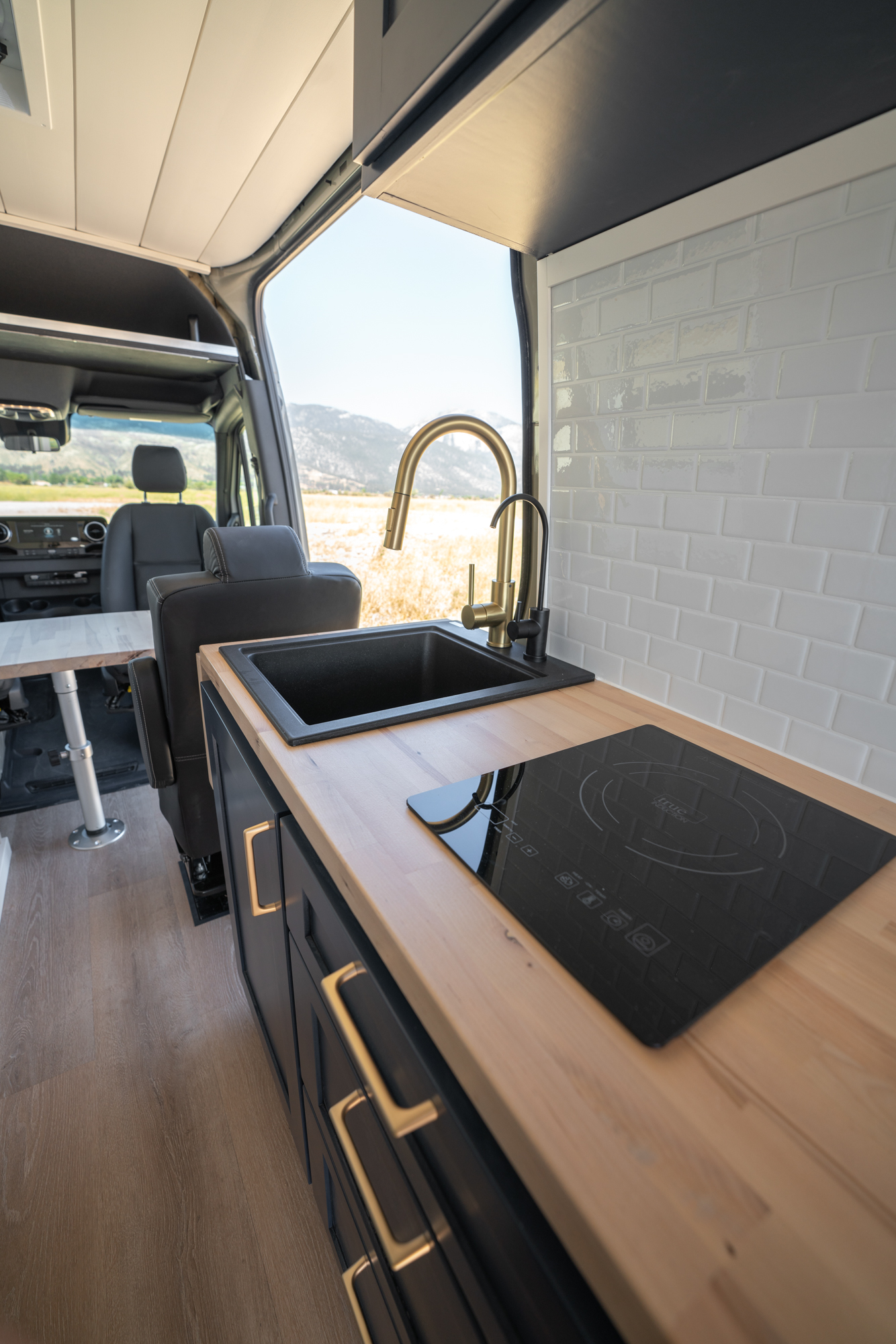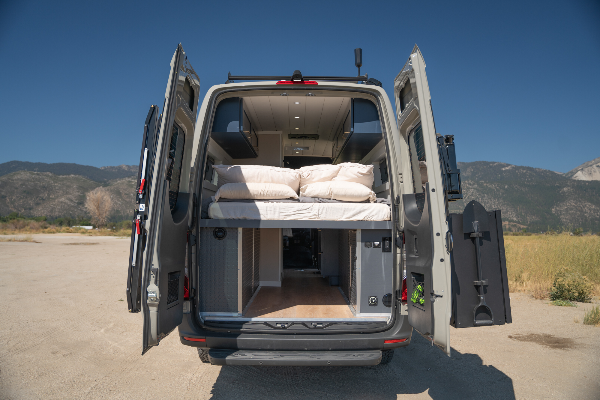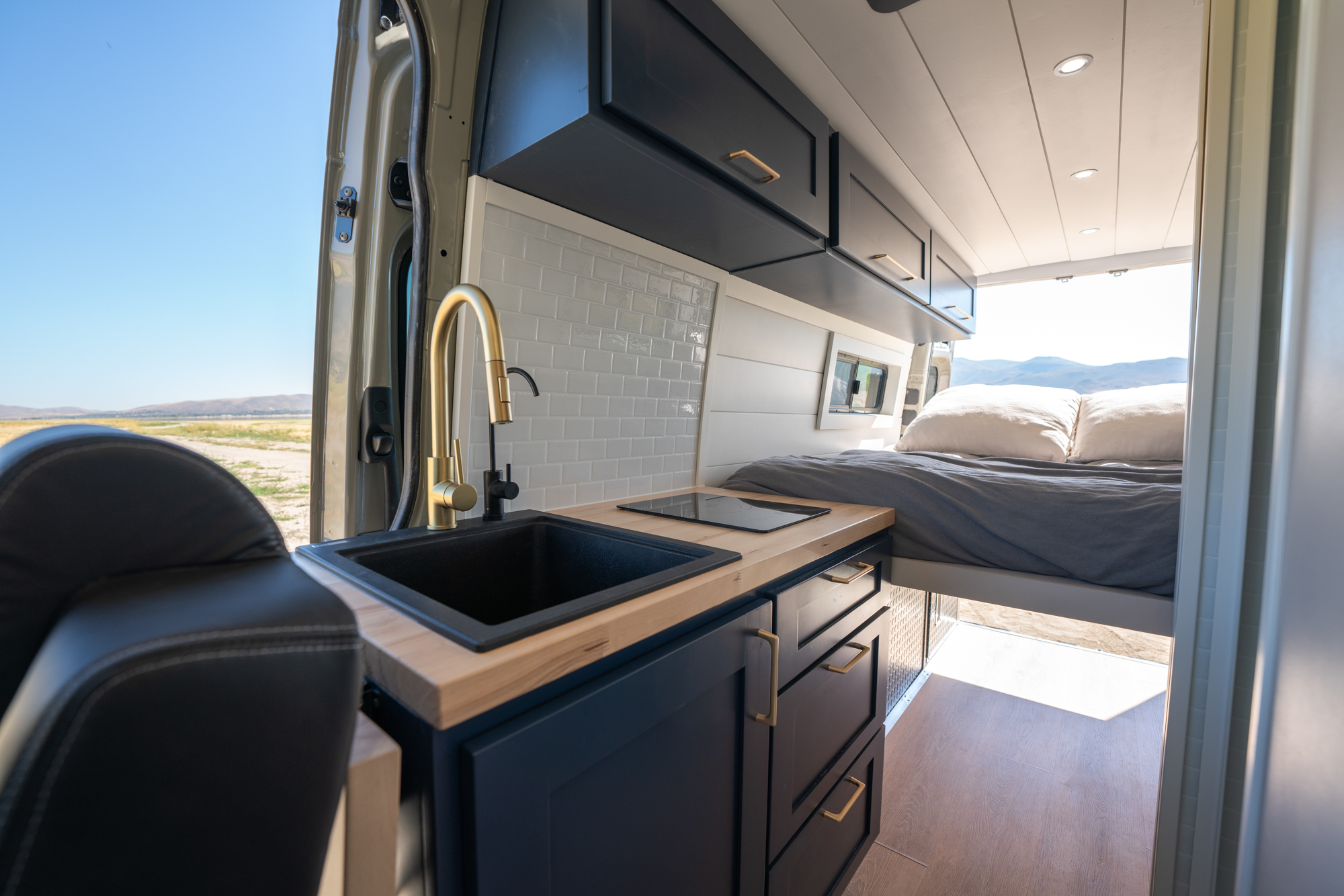 Inside, the van features a queen-size bed, a convertible bench seat bed, and a 32″ indoor shower, along with plenty of cabinet storage. The kitchen includes an induction cooktop, Dometic fridge/freezer, Espar D2L heater, WeBoost cell booster, and a Nomadic Cooling 12V air conditioner.