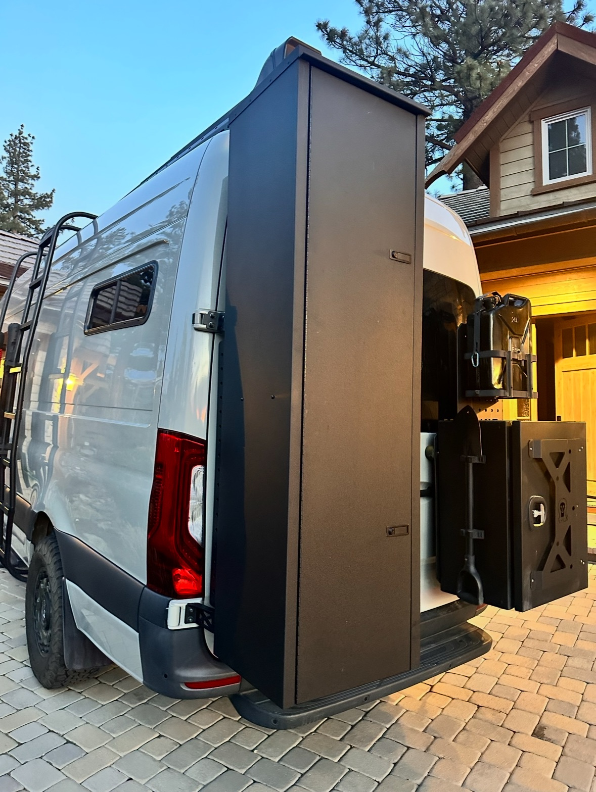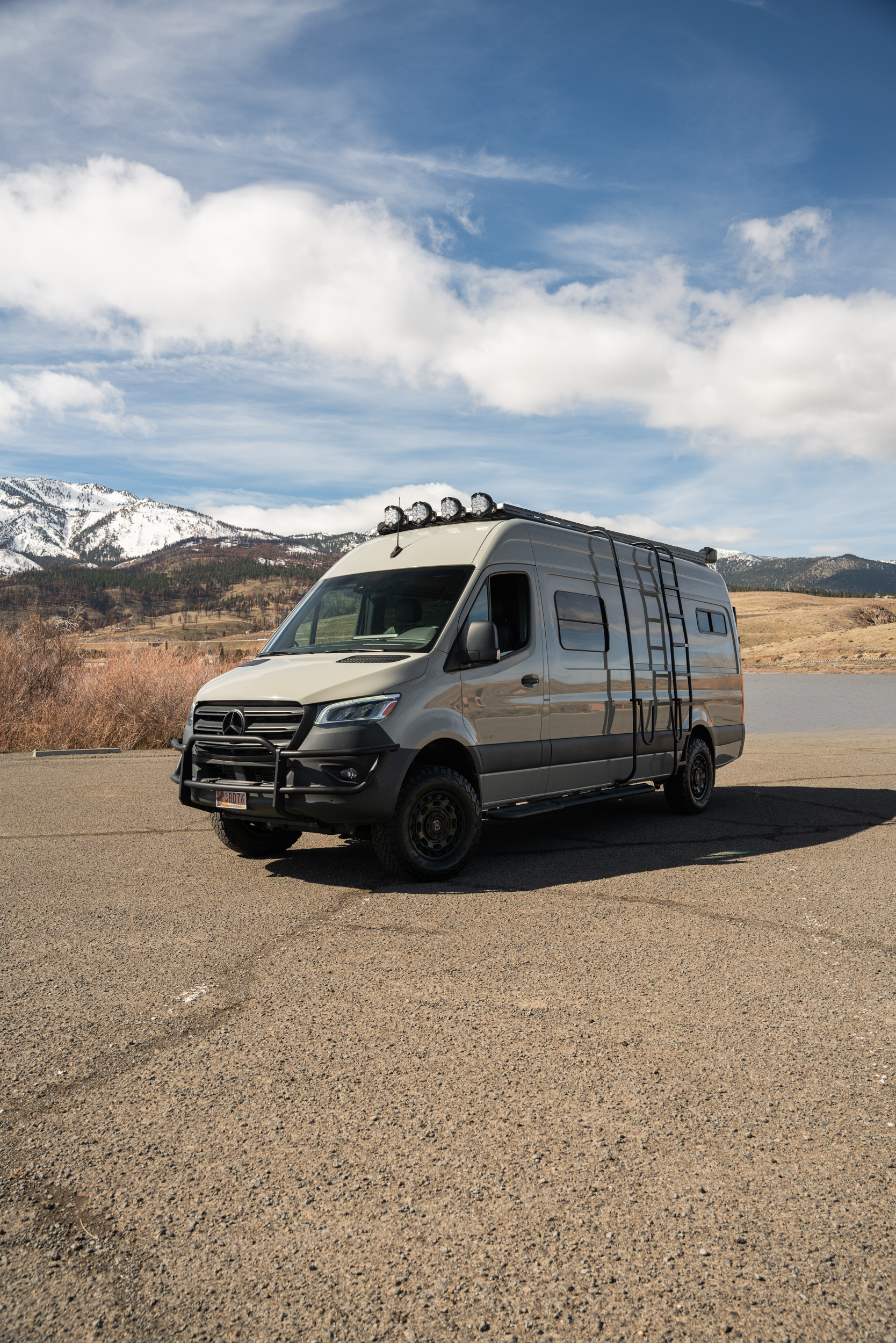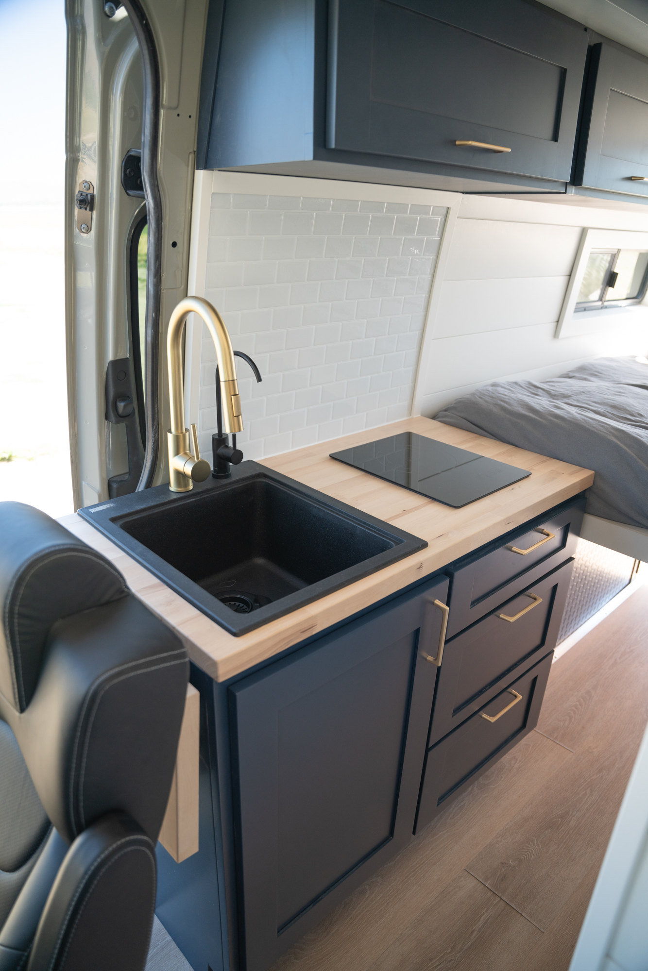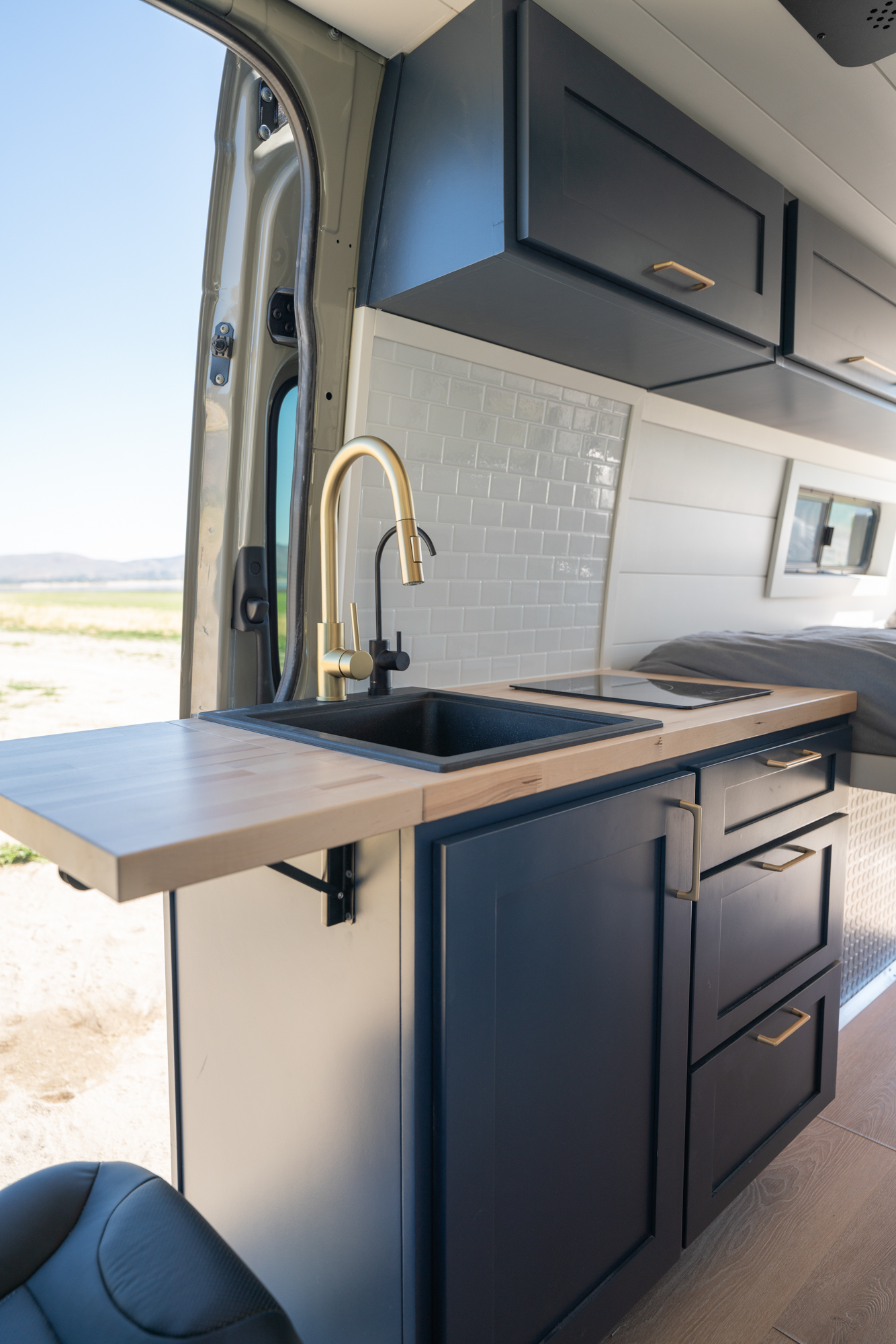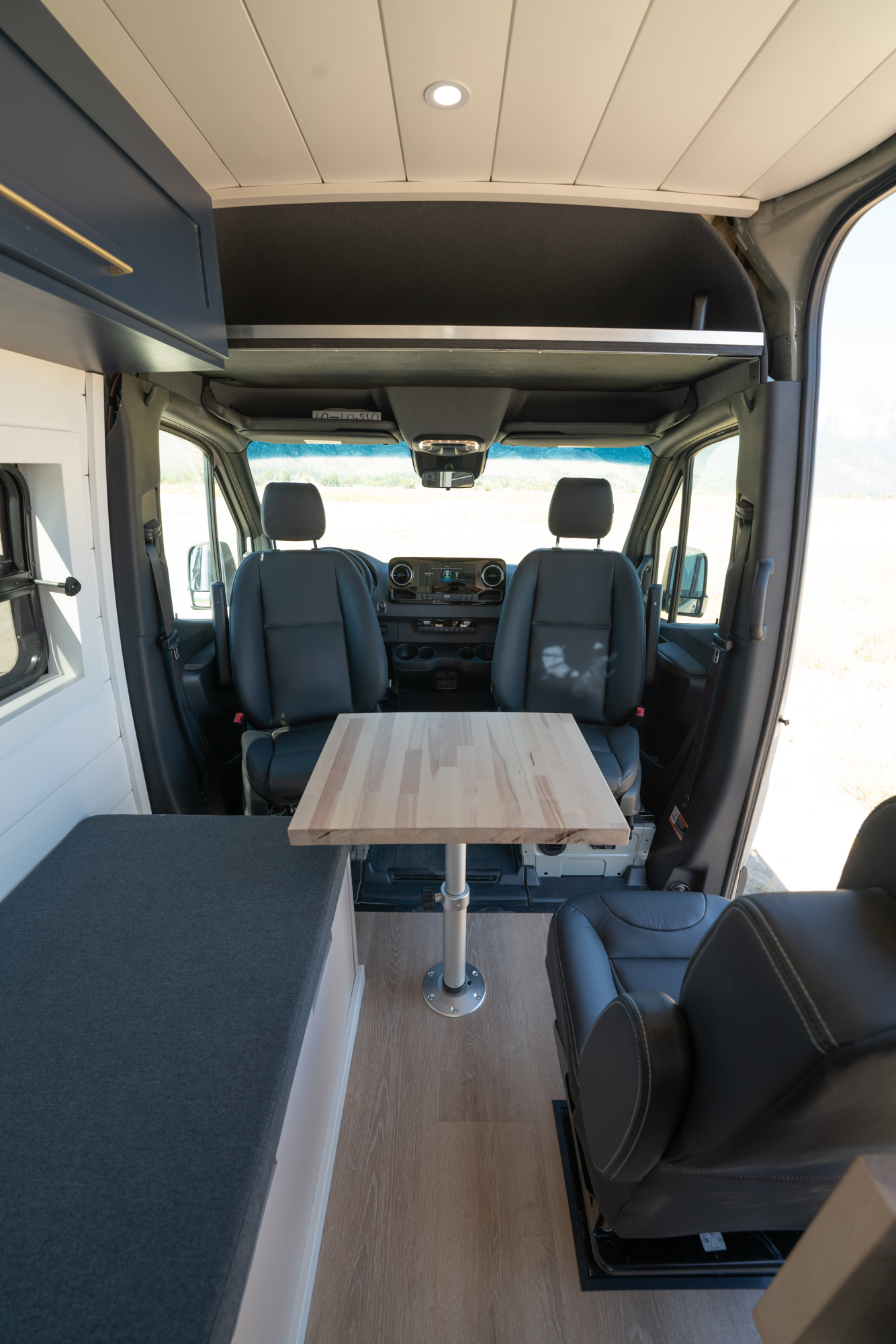Inside, the van features a queen-size bed, a convertible bench seat bed, and a 32″ indoor shower, along with plenty of cabinet storage. The kitchen includes an induction cooktop, Dometic fridge/freezer, Espar D2L heater, WeBoost cell booster, and a Nomadic Cooling 12V air conditioner.