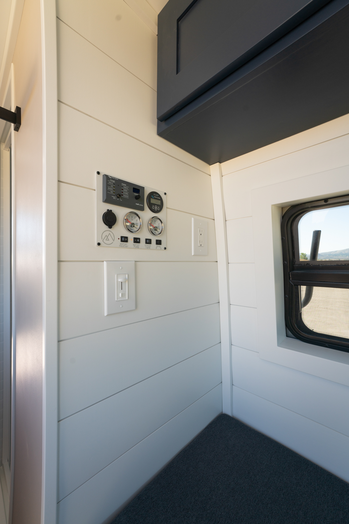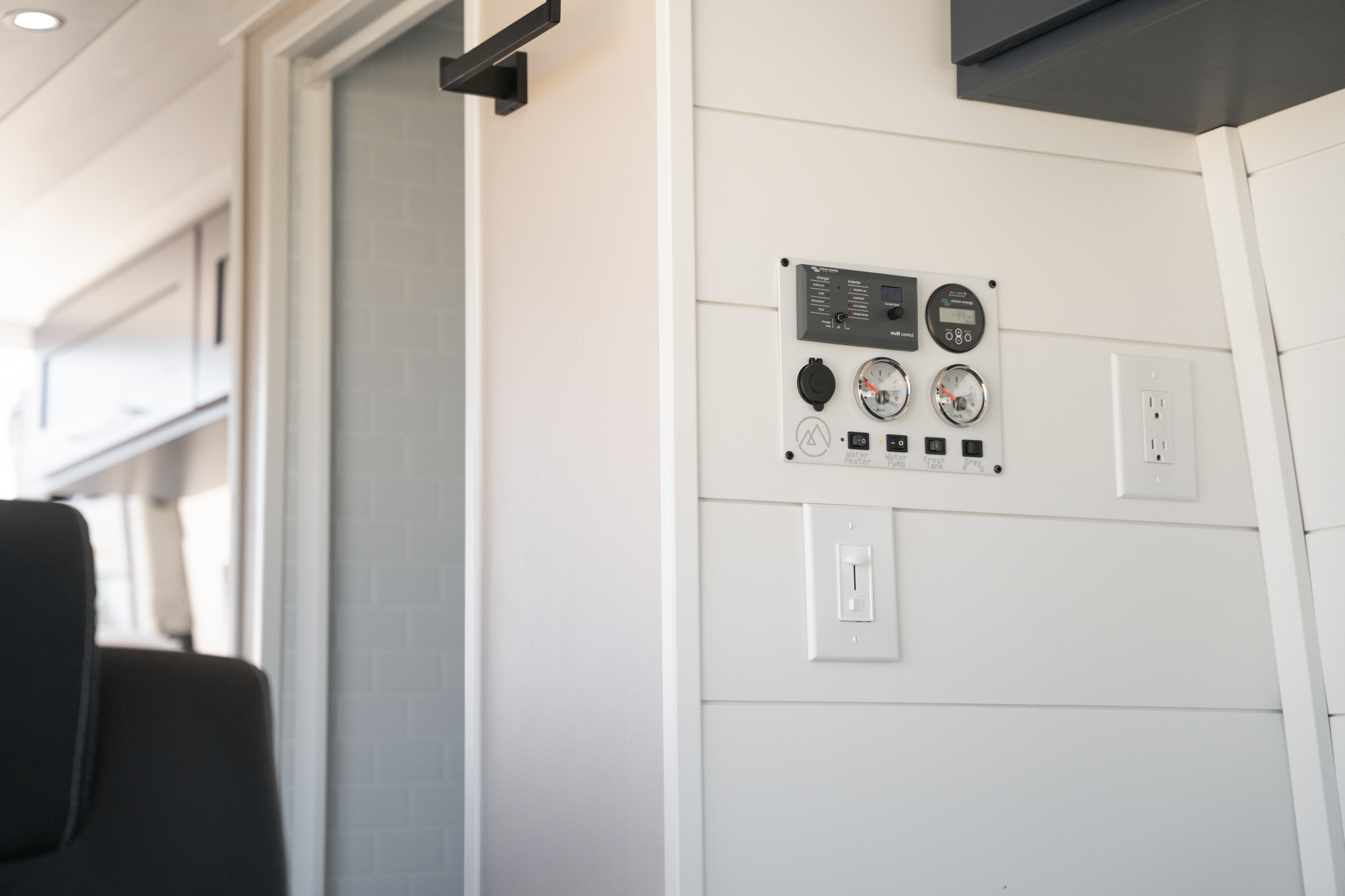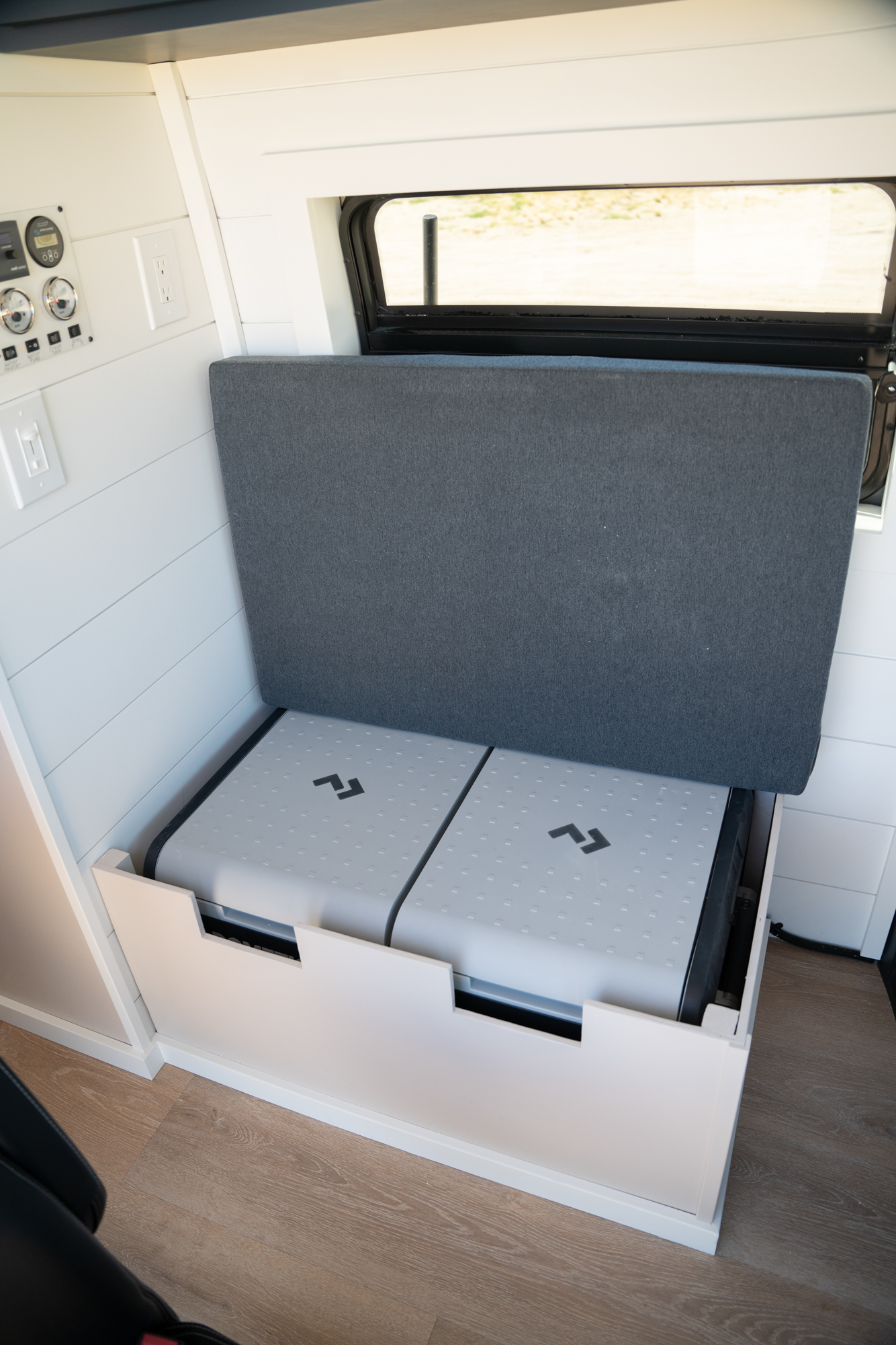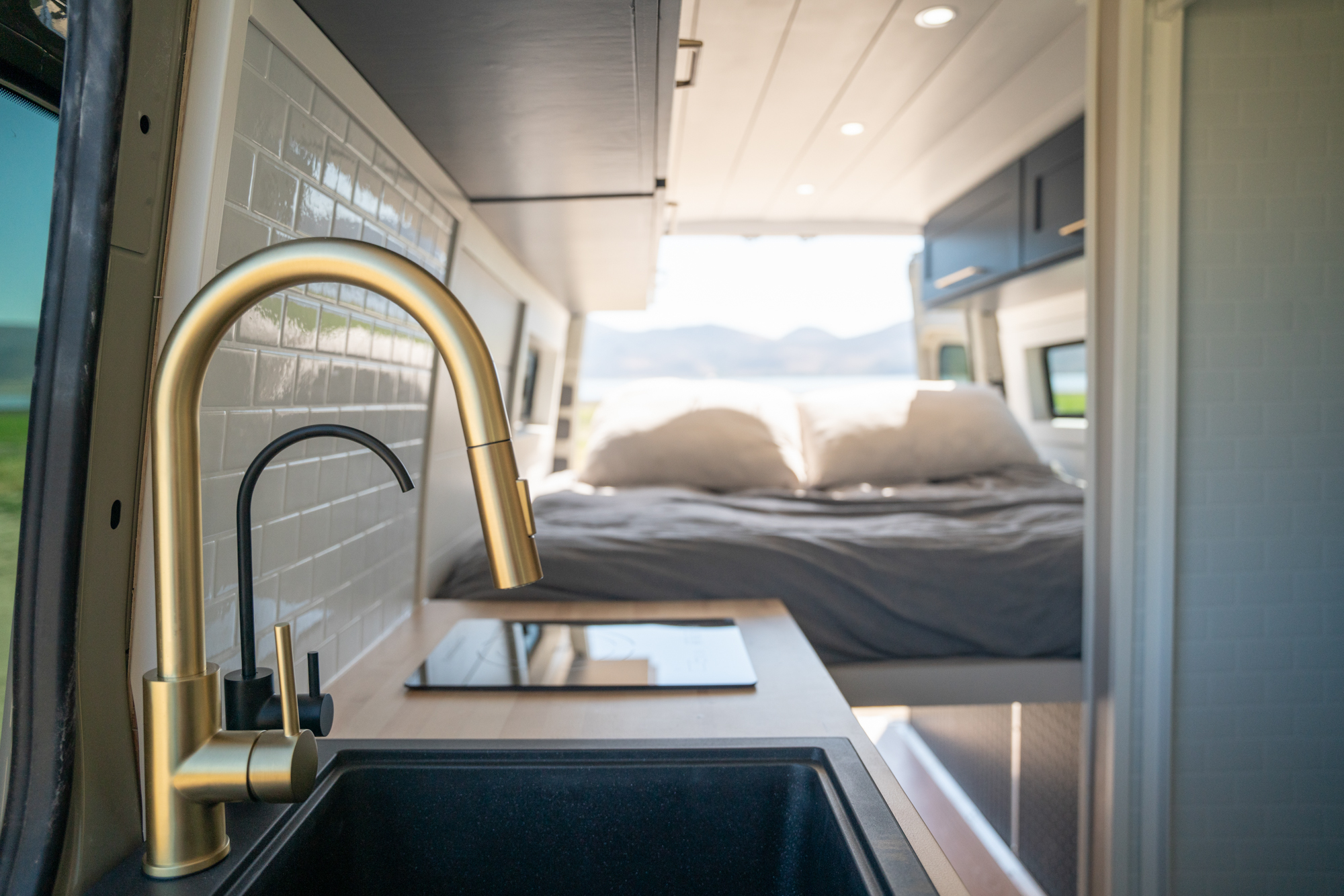 The plumbing system includes a 42-gallon fresh water tank, 20 gallons of grey water for the shower, and 5 gallons of grey water for the sink. The fresh water tank is mounted inside the van, while the grey water tanks are mounted underneath.