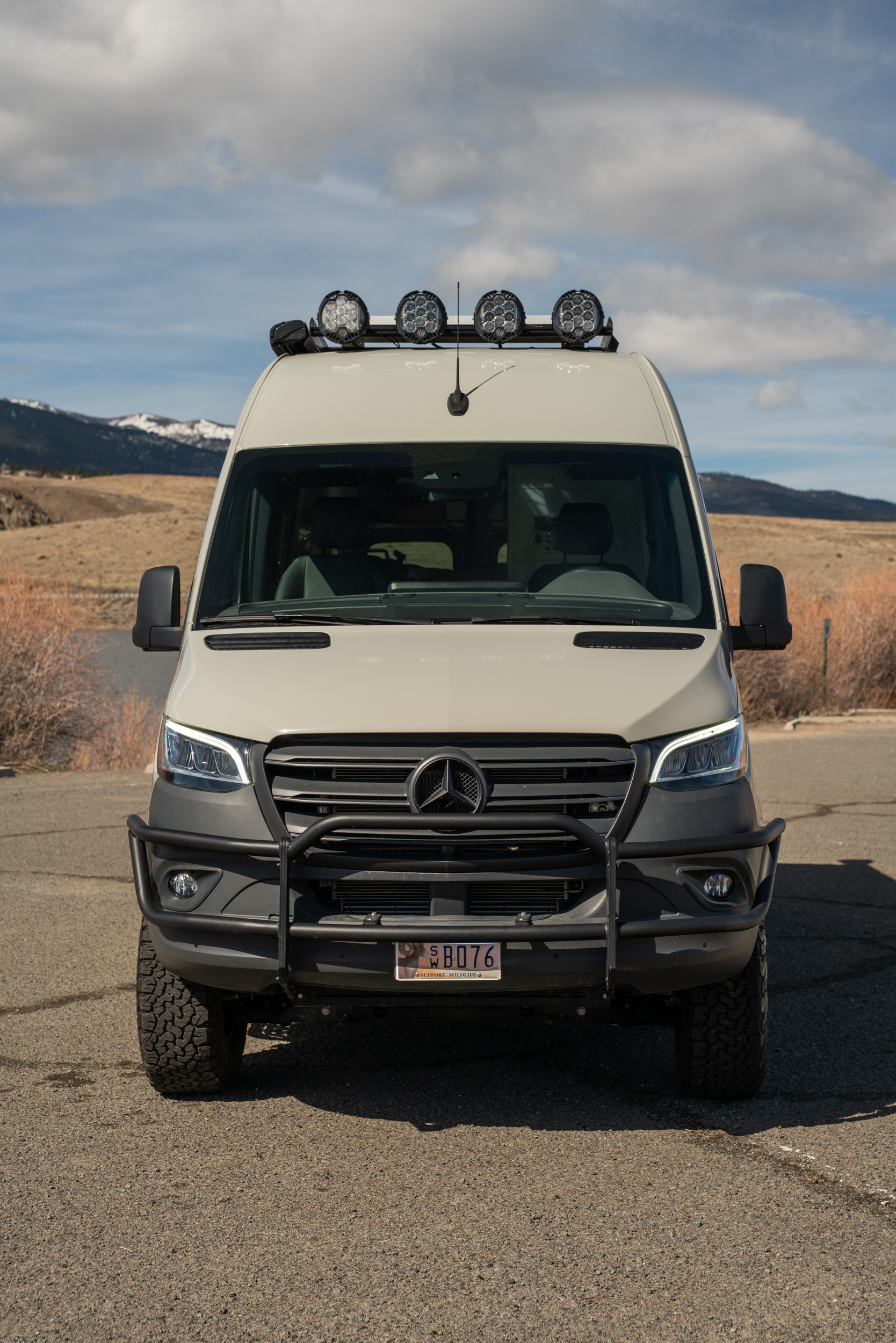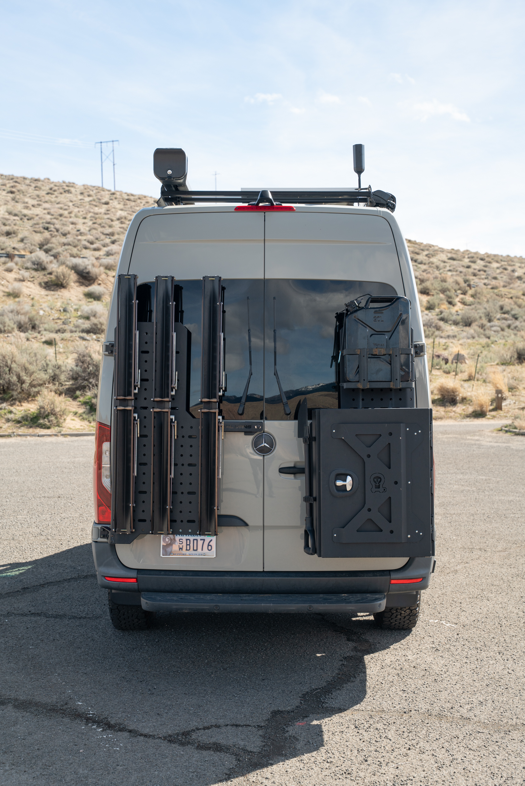 Exterior upgrades include Baja Designs LP9 lights mounted to the front of the roof rack to turn nighttime into daytime on dirt trails. The rear doors are equipped with several Owl Vans accessories and three 1UP bike trays. Additional exterior upgrades include a Fiamma F80S awning, Aluminess front bumper, Aluminess surf pole and surf hooks, and a fly rod holder mounted to the roof.