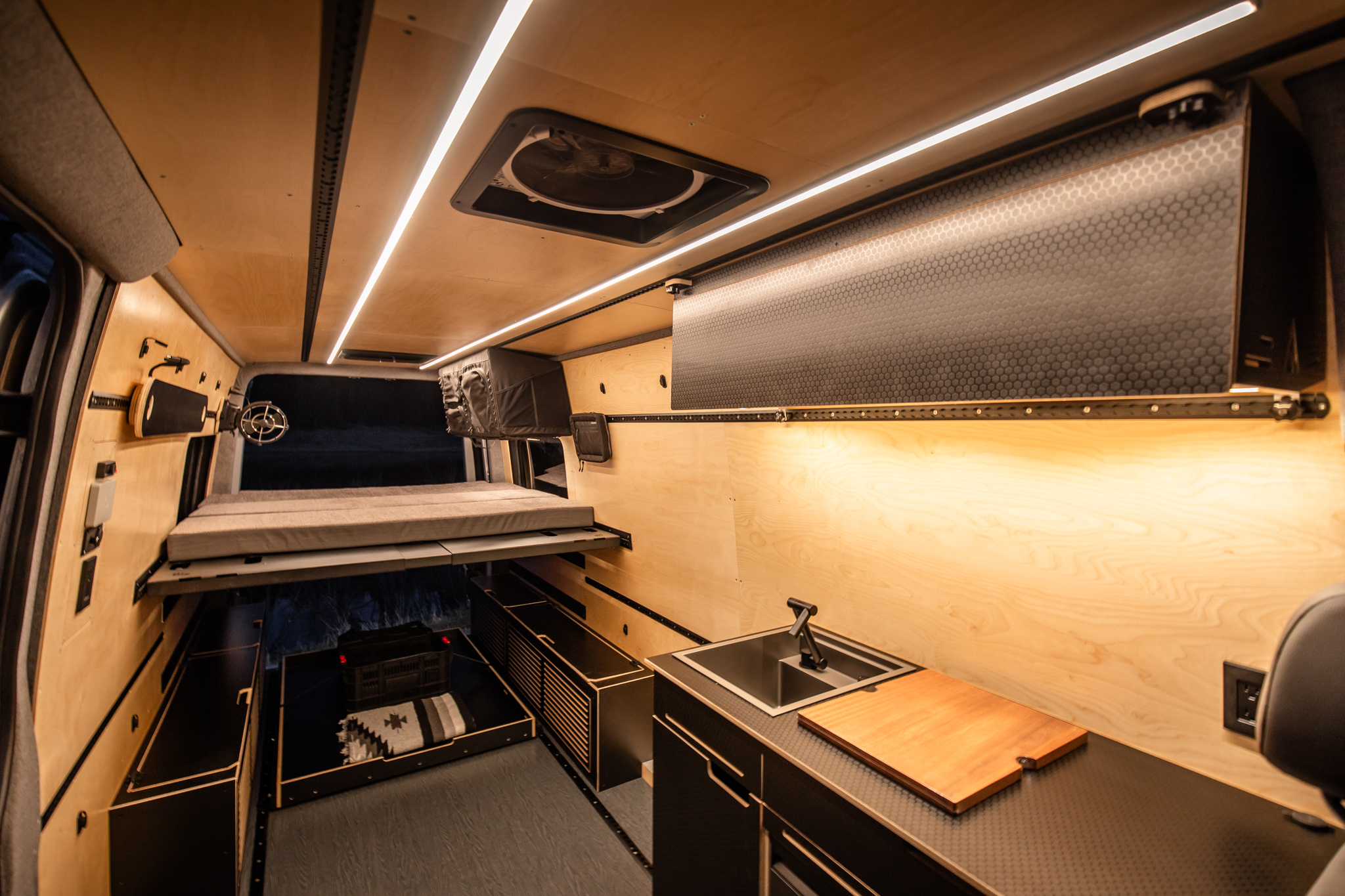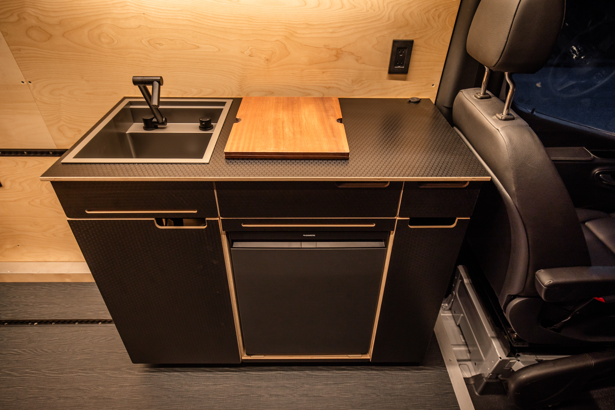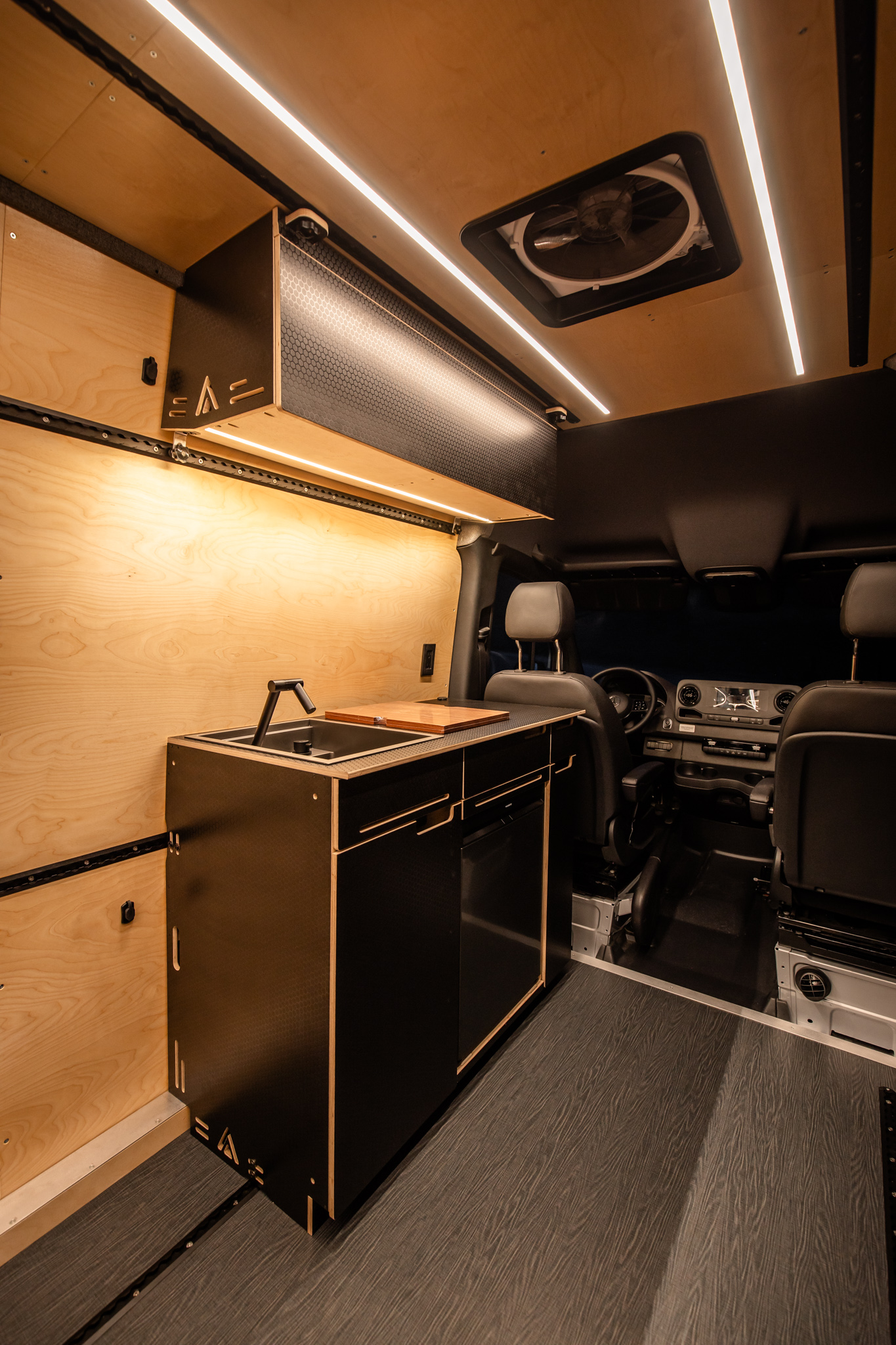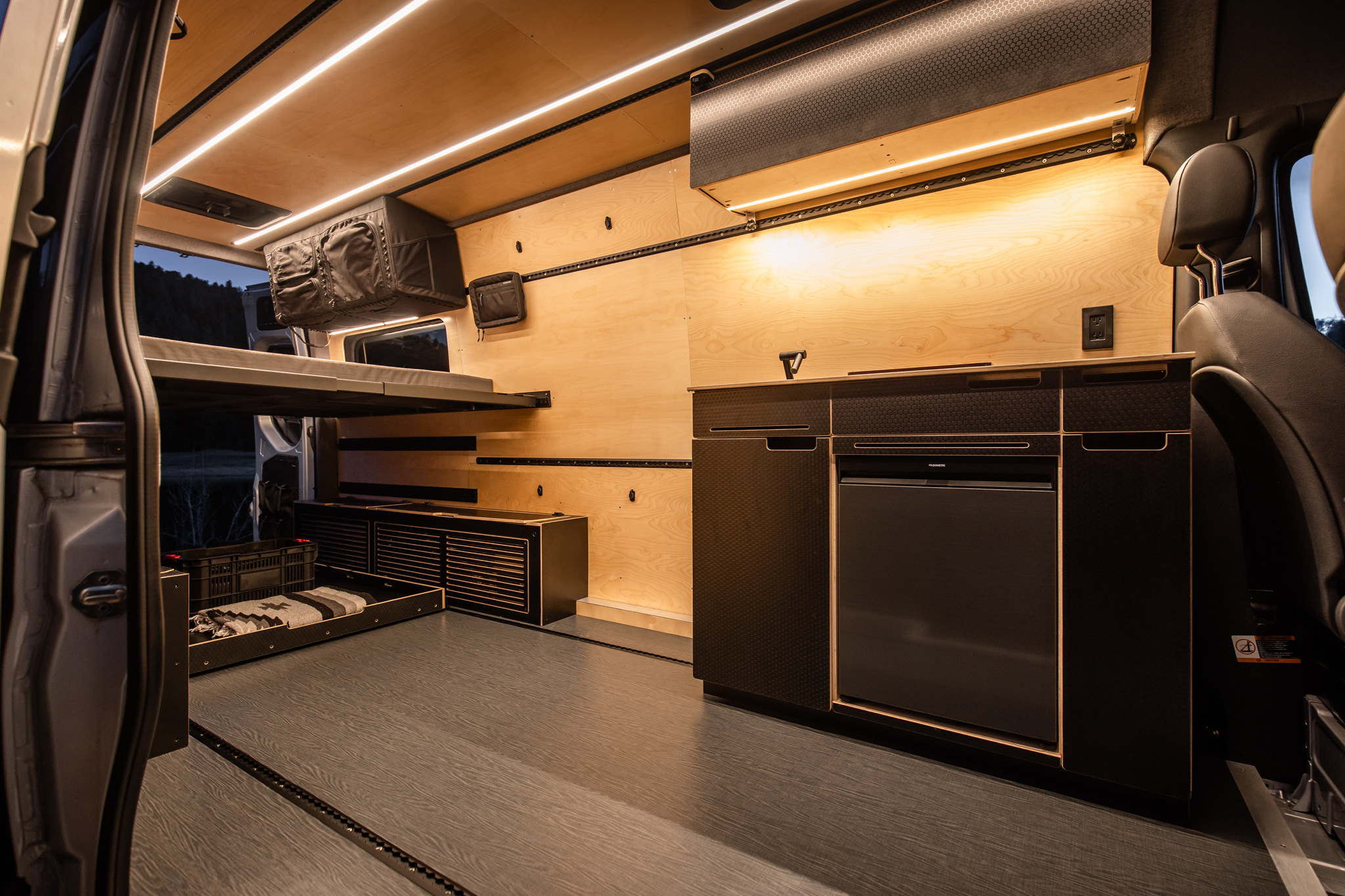Built using the Venturhaus MVS Platform this 4×4 camper van offers unparalleled value, allowing you to customize your living space effortlessly. The core of the MVS Platform is the Foundation, a system of walls, floor, and ceiling which integrate insulation, 12V electrical quick connects, birch paneling, Lonseal military grade flooring and Van Essentials Venture Track mounting rails. This allows any module, whether it is a base cabinet, or overhead cabinet to be located anywhere in the interior and receive power to it’s devices.
