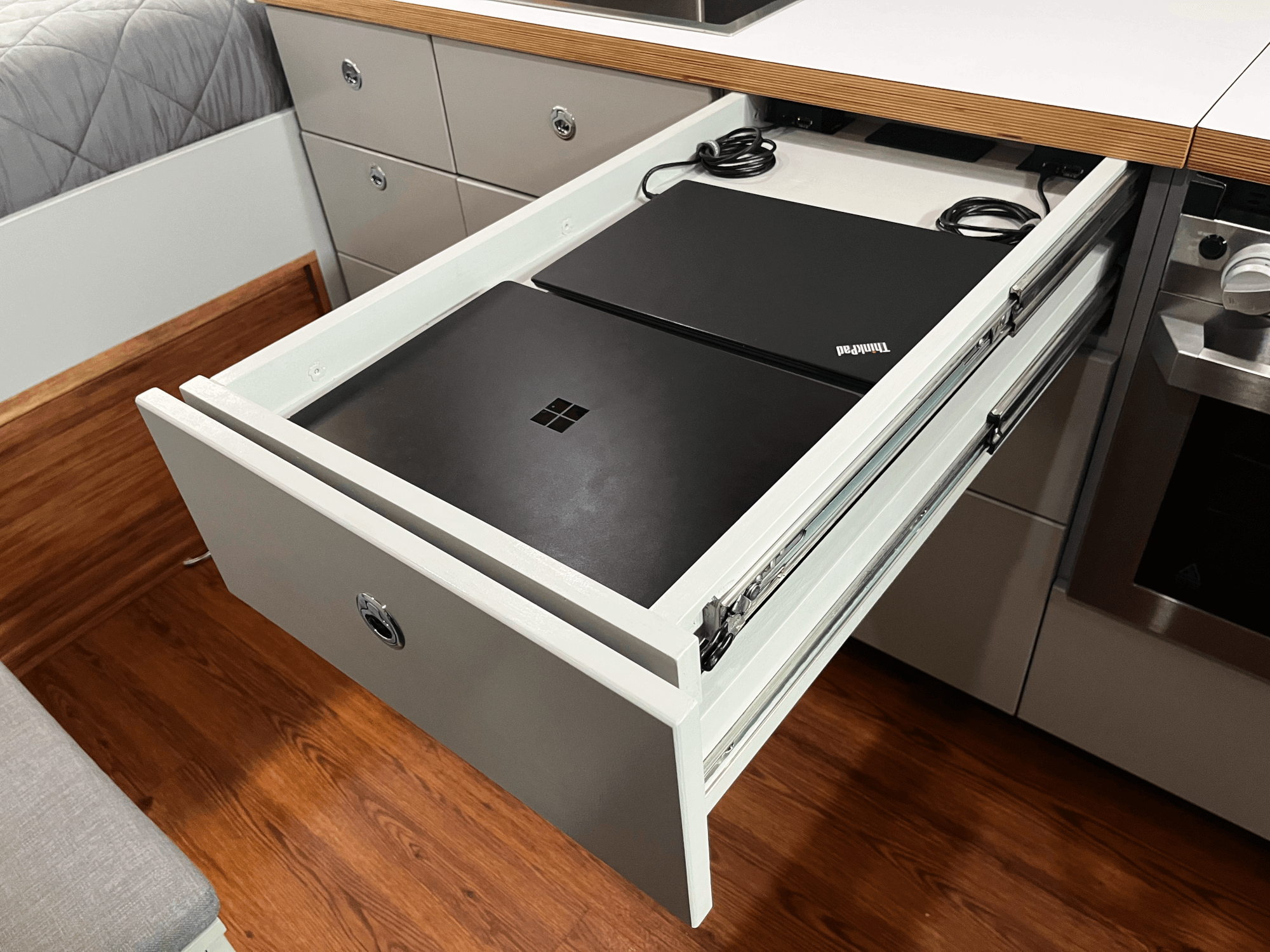 -2x Hidden Drawers for laptops/camera gear with USB & AC outlets